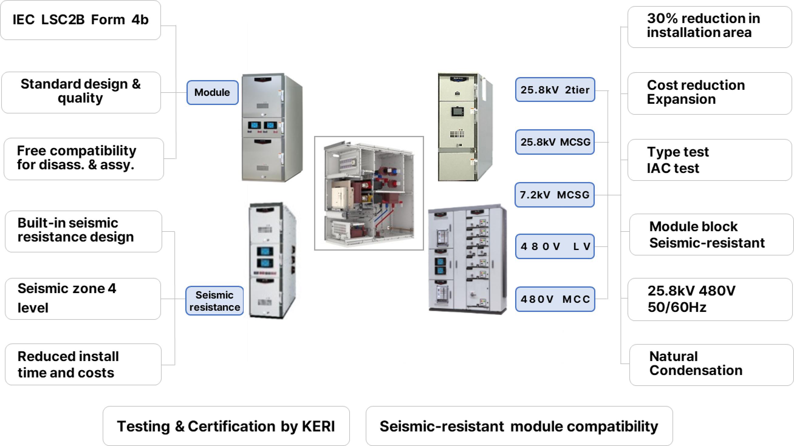Circuit breaker, bus and cable control sections within the switchgear are installed in shielded modules and interconnected using seismic-resistant components. Its reliability is proven through seismic resistance tests, IEC type tests and internal arc classification tests.